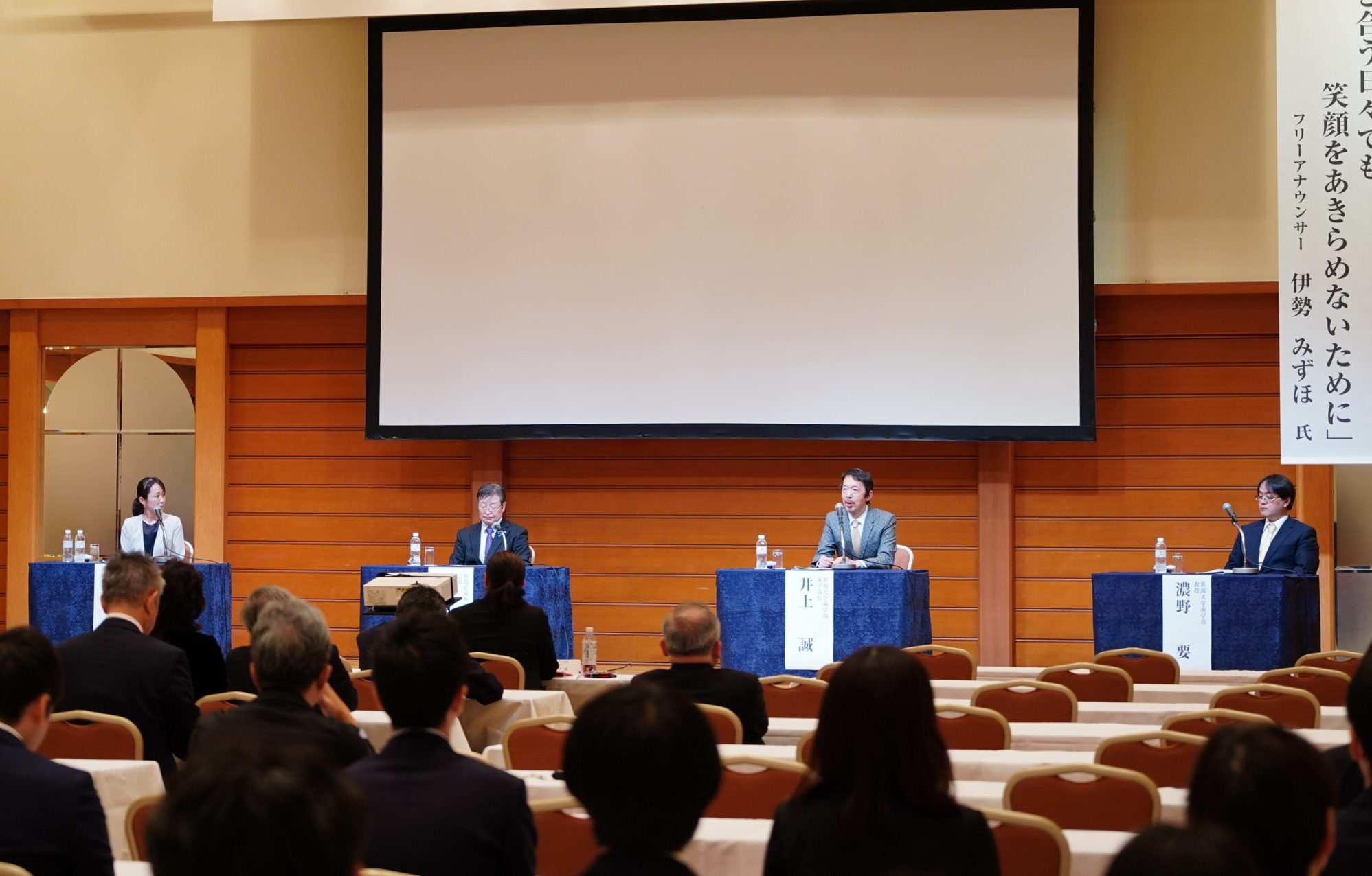 続いて、「健康を通じて支え合う地域社会」をテーマにパネルディスカッションが行われ、濃野要 歯学部教授が進行を務めました。伊勢様のほか、新潟県歯科医師会会長 松﨑正樹 様、井上誠 歯学部長が登壇し、地域における歯科医療の役割や、健康と笑顔を守るための取り組みについて多角的な視点から意見が交わされました。