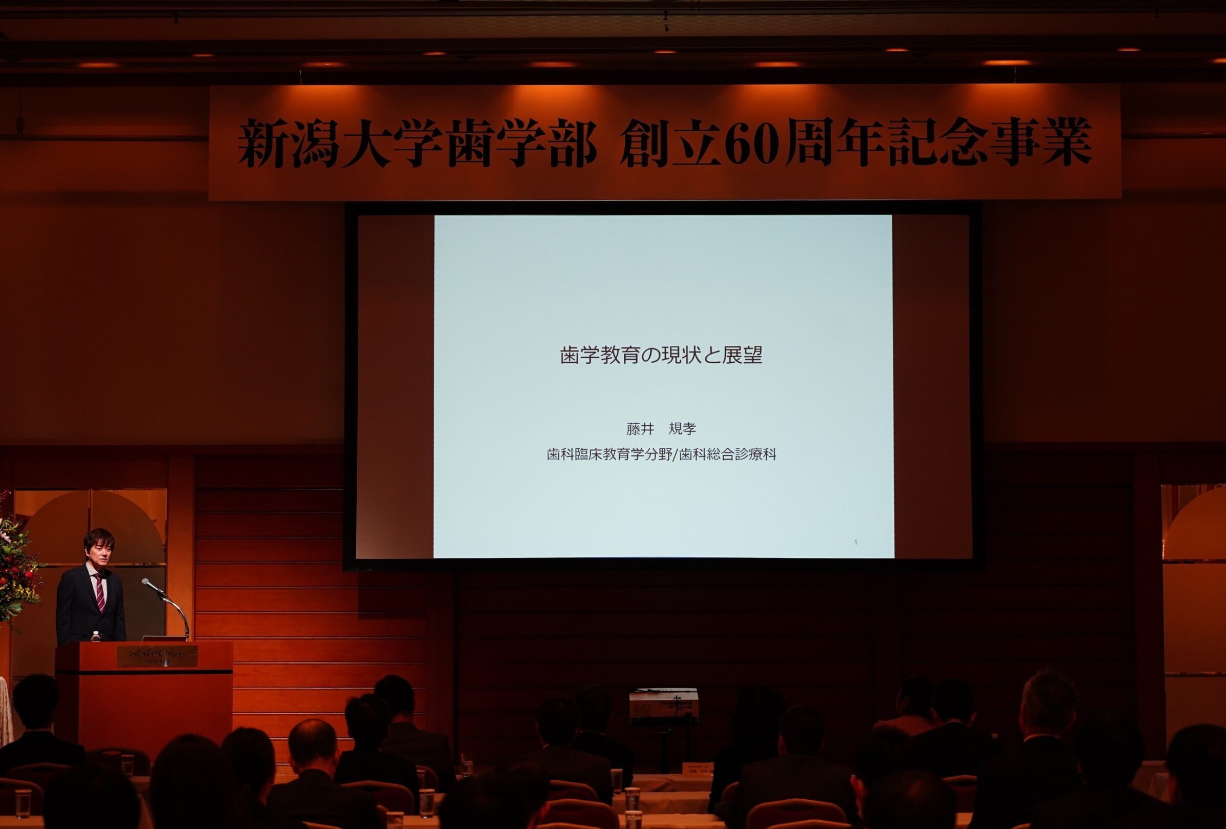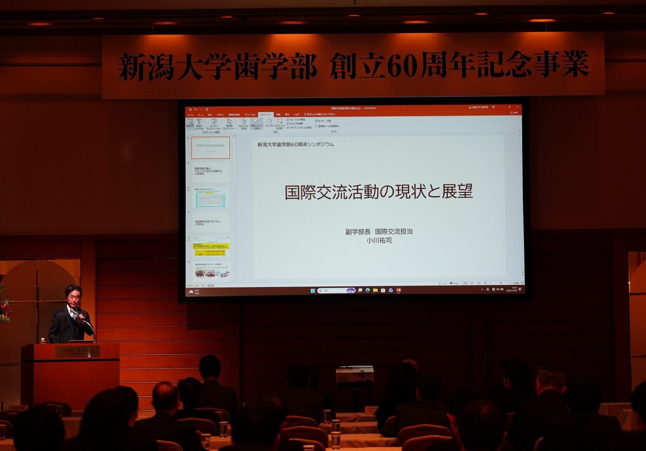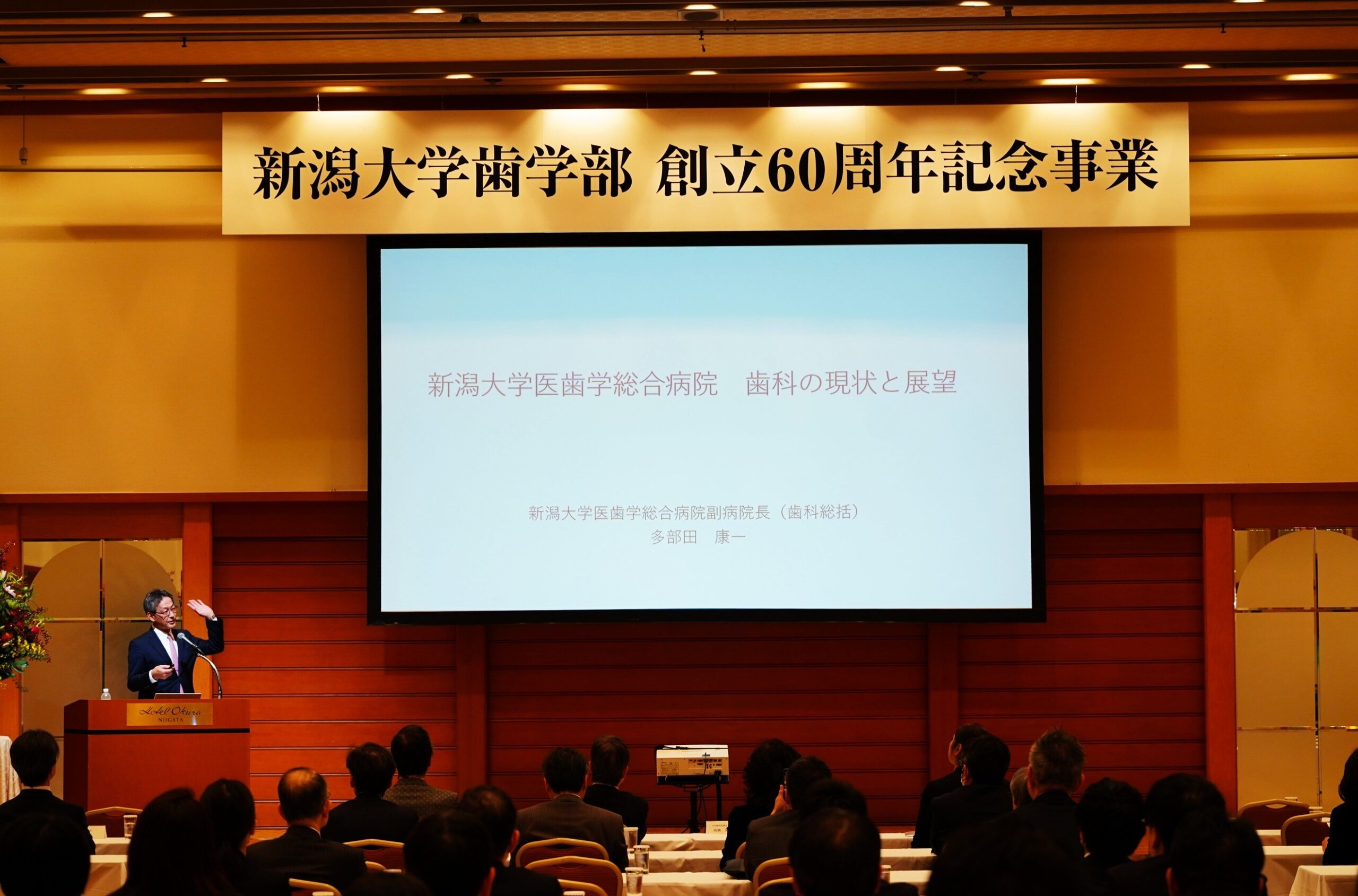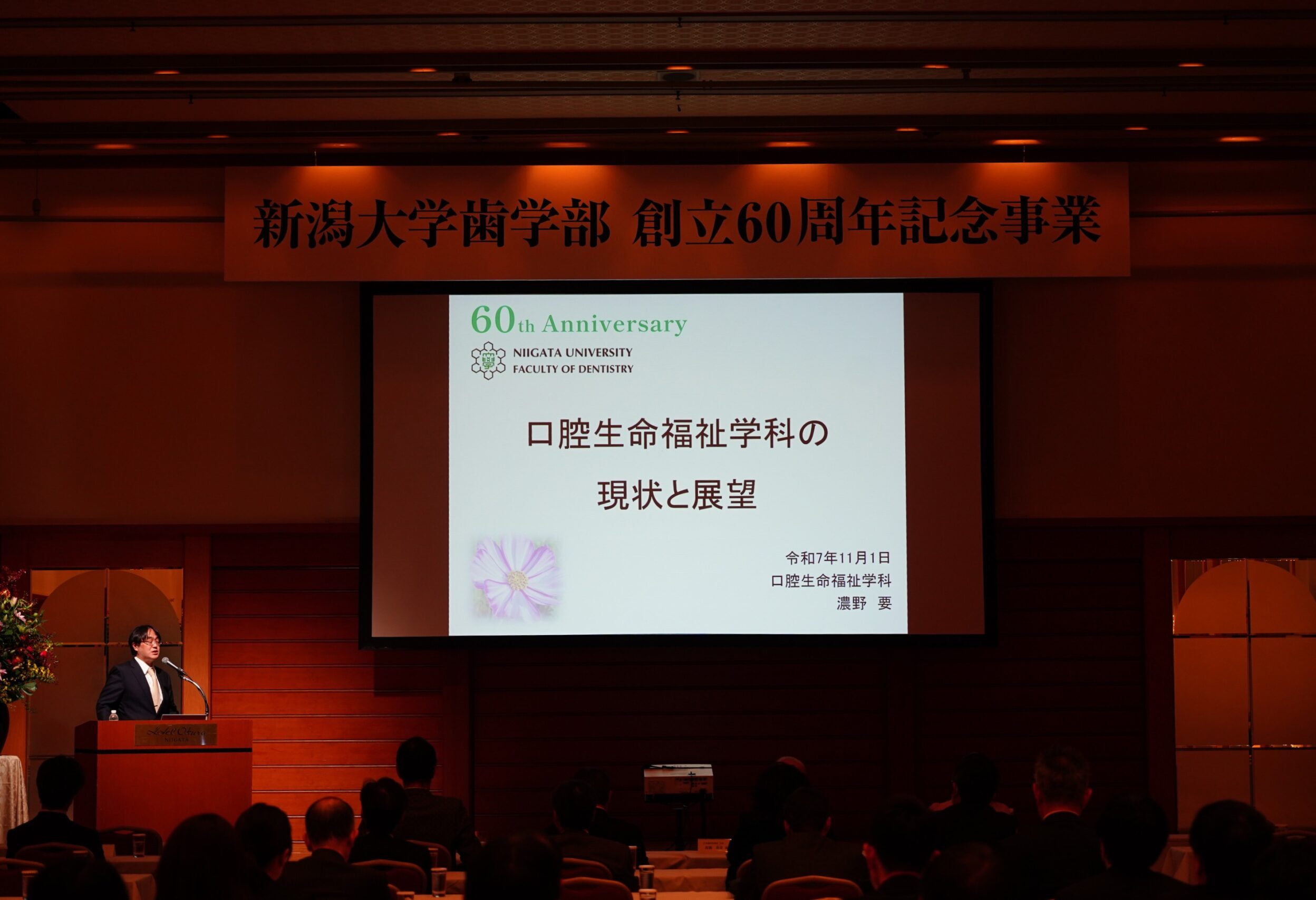 歯学部は令和7年(2025年)に創立60周年を迎え、これを記念して11月1日(土)、新潟市中央区のホテルオークラ新潟にて「創立60周年記念事業」を開催しました。市民フォーラム、講演会、祝賀式典、展示コーナーなど多彩なプログラムが行われました。